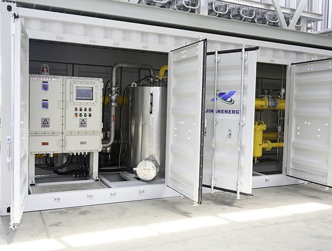 LNG調(diào)壓計(jì)量撬是液化天然氣經(jīng)過主氣化器氣化后的氣體, 由于等壓氣化壓力基本保持和儲(chǔ)罐壓力相近, 一般用戶需求壓力是一個(gè)恒定的范圍內(nèi)的值,需要進(jìn)行調(diào)壓穩(wěn)壓。同時(shí)為了計(jì)量核算費(fèi)用或廠內(nèi)核算成本,對(duì)氣化后的LNG流量進(jìn)行計(jì)量, 為了實(shí)現(xiàn)以上的功能組合在一起的裝置叫LNG調(diào)壓計(jì)量撬。LNG調(diào)壓計(jì)量撬由矩形撬塊、調(diào)節(jié)匯管、控制閥、計(jì)量管、流量計(jì)、調(diào)節(jié)閥、調(diào)節(jié)管、過濾器、出氣管、進(jìn)氣匯管、進(jìn)氣口、出氣匯管、排污管和安全放氣閥組成??筛鶕?jù)用戶的需要,配套加入加臭、加藥系統(tǒng)。